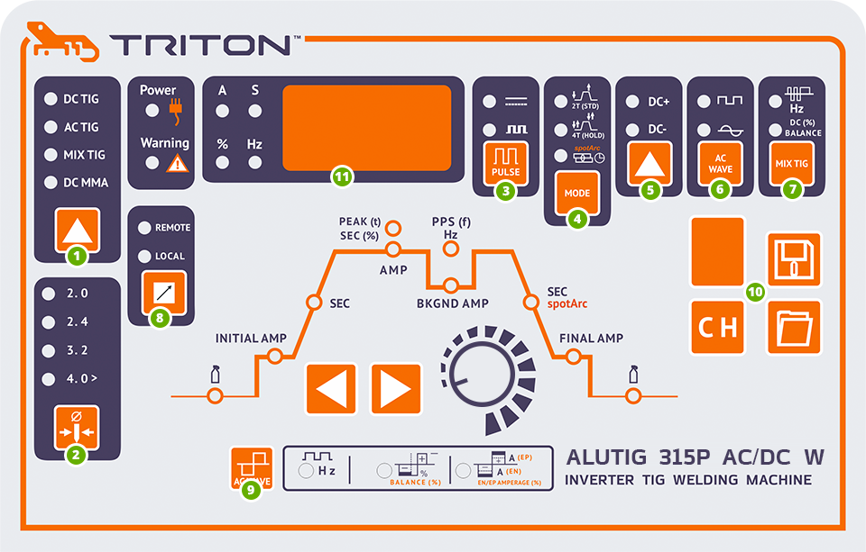 Опытные сварщики при работе с инвертором TRITON ALUTIG 315P AC/DC W оценят возможность настройки трех основных параметров переменного тока при сварке в режиме AC TIG (BALANCE %, частота Hz и EN/EP AMPERAGE %), благодаря которым достигается гибкая и точная настройка сварочного тока.